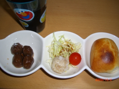 朝)6:45 パン(ミックスジャム) キャベツ ミニトマト 海老シューマイ