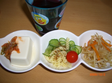 夜)18:00 豆腐 キムチ マカロニサラダ もやし炒め
