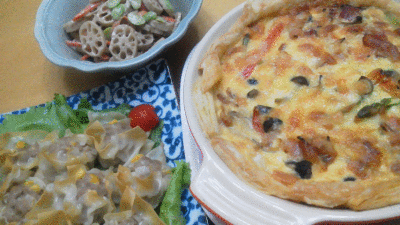 夕食 キノコのキッシュ6分の一・シュウマイ3個・レンコンのサラダ