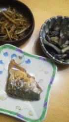 夕飯 鯖の味噌煮・きんぴらゴボウ・茄子のごま和え・マスカット・コーヒー