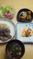 夕食 かに玉・焼き肉・レタス・カボチャと厚揚げの炊いたん・味噌汁・ピオーネ