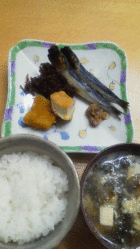 朝食 ご飯・いわし・いかなごクギ煮・味噌汁・野菜ジュース
