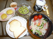 トースト カレー(ニンジン たまねぎ じゃがいも 豚肉) チン野菜(カリフラワー ブロッコリー ニンジン アスパラ キャベツ えのき) ヨーグルト バナナ半分 キウイ1個